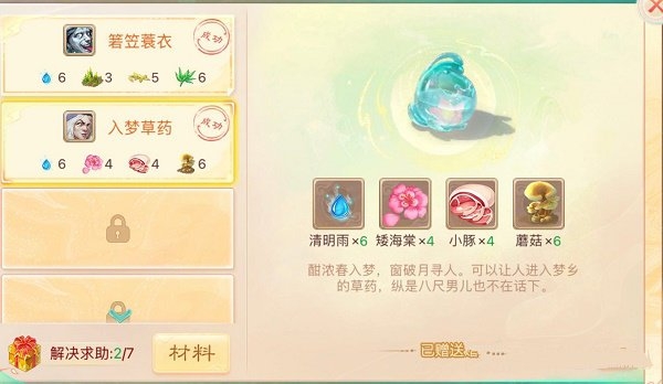 入梦草药=蘑菇+矮海棠+小豚+清明雨