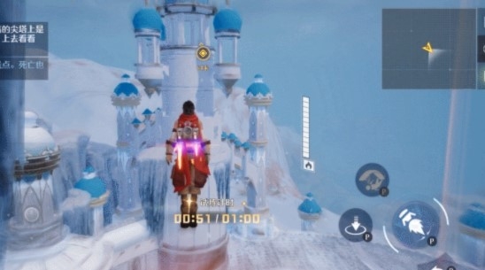 步骤二:跳上1号点位后,迅速用钩锁拉上2号点的蓝色原顶。