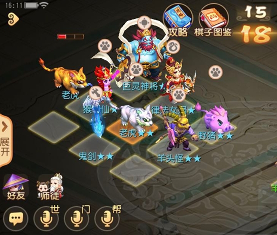 小怪大致的组成以老虎、猴小仙、羊头怪和野猪组成的野兽羁绊为主、此外有律法女娲的祝福格子加成,鬼剑的属性加成和特殊效果追击、以及巨灵神将的辅助输出,是一套把攻击buff拉满的阵容。