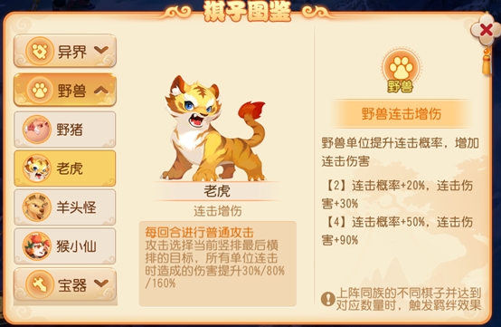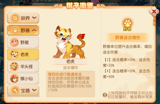 老虎的特点是连击增伤,因此作为主力输出收益最大,可以搭配鬼剑提升属性。野猪阵亡时会随机提升一名野兽单位本场战斗的物理伤害,可以放在更容易被攻击到的位置。主力输出单位放在中间一列靠前,尽快点对点击破地方主力老虎。