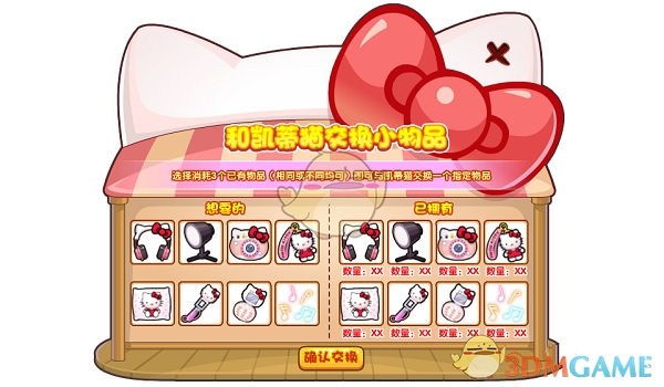 点击【交换】按钮,选择消耗3个已有物品(相同或不同均可)还可与凯蒂猫交换一个指定物品哦。