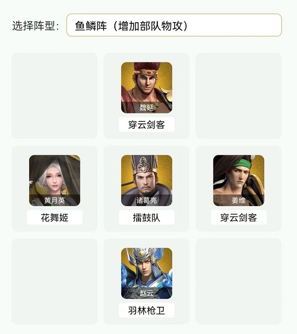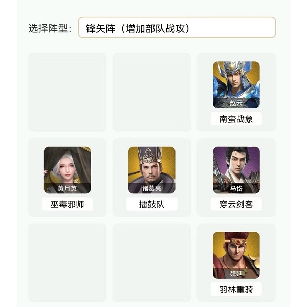 武将兵种搭配姜维(穿云剑客)魏延(穿云剑客)诸葛亮(擂鼓队)赵云(羽林枪卫)黄月英(花舞姬)