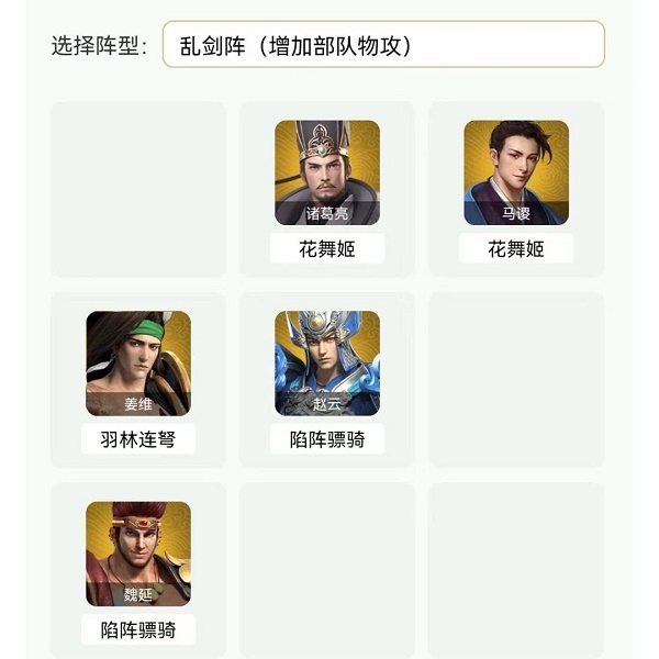 武将兵种搭配马谡(花舞姬)诸葛亮(花舞姬)赵云(陷阵骑兵)姜维(羽林连弩)魏延(陷阵骑兵)