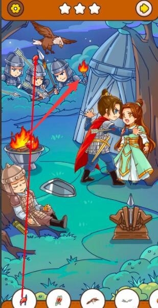 1、先用火盆里燃烧的木柴点亮草丛里躲着士兵手里的火把,中间士兵头顶的就是要找的第一件物品。