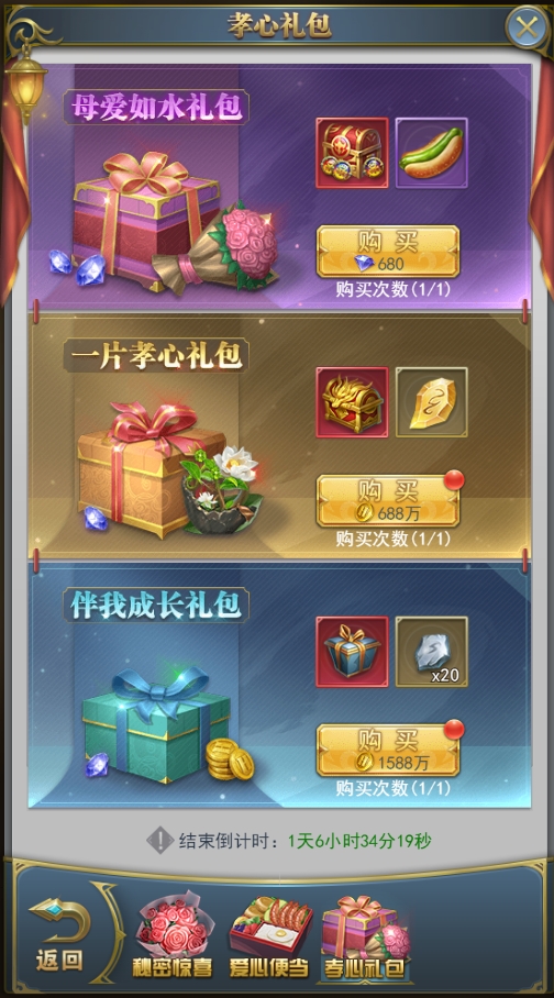 活动期间,开启三种礼包,礼包奖励丰厚,物美价廉。