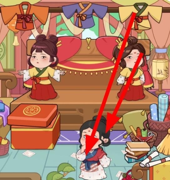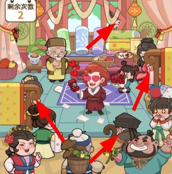 步骤2:点击躲在左边布料后面的女人、躲在右边布料后面的女人、躲在窗户后面的女人、拿着拐杖的老人,这些都是看热闹的人。