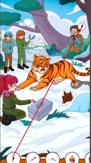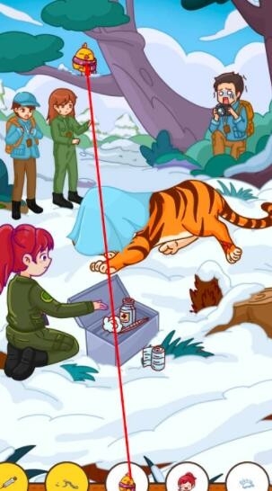 5、将急救箱中的酒精,和地上的纱布拖到老虎受伤的腿上。包扎好老虎的伤口,女主露出了微笑,点击即可获得第五件物品。