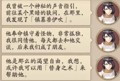 因为同情镇墓兽,他用替身之术把镇墓兽换了出来,没了镇墓兽看守,八岐大蛇就顺利从狭间跑了出来,路人甲阴阳师这才知道自己上了八岐大蛇的当,之后就是衔接游戏主线剧情了。