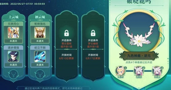 6、区域中的2个挑战都通过困难难度时,即可点亮对应区域的神鹿徽记,点亮神鹿徽记达到一定数量可以获得九色神鹿的契约、进化以及突破,点亮所有神鹿徽记即可解锁九色神鹿的逆元化挑战;