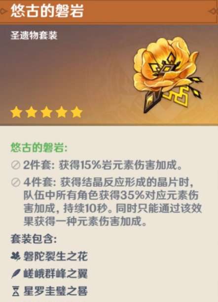 1、 4华馆:防御力提高30%。 装备此圣遗物套装的角色在以下情况下将获得问答效果:在场上用岩元素攻击命中敌人后获得一层,每层问答效果会为队伍提供6……的防御力和6%岩元素加成。