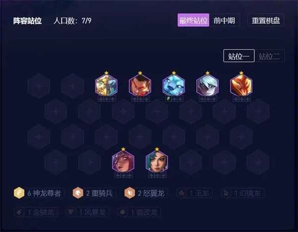 搭配的羁绊有:6神龙尊者、2重骑兵、2怒翼龙,如果上八人口,可以将卡尔玛换成亚索,然后再上一个重骑兵。
