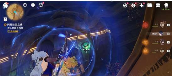 站在石头旁边,吸引巨型机器人的炮火击碎石头就能进去了,如果找不到石头可以开元素视野,能看到白色的石头哈。