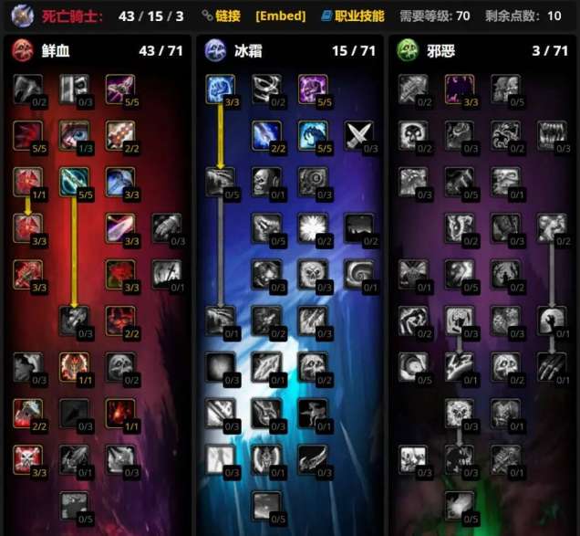 第一套是43/15/3,强化了冰触的单拉天赋加法,能提供超高的仇恨输出。鲜血系点出了必备的大墓地,然后在冰霜系投入了15点加强冰触射程与冰霜伤害。邪恶系的3点命中天赋是必备的。