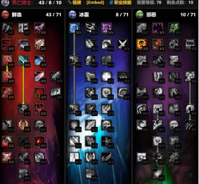 第二套是43/8/10,与第一套天赋的区别在于强化了邪恶系的疾病持续时间,同时点出凋零减冷却时间15秒,这在5H相当关键,而且多出了两点躲闪天赋。