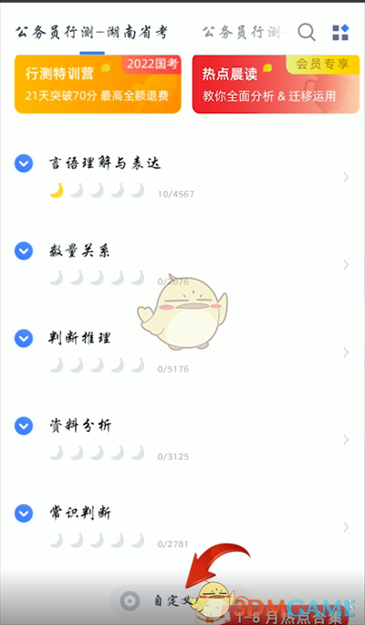 1、在粉笔app主页面中点击下方的练习,随后将题库页面拉至最底部,在最底部中点击自定义刷题。