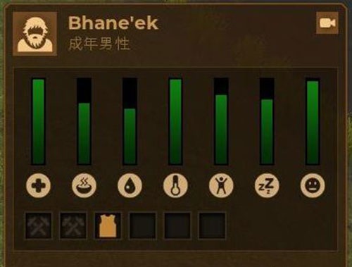 进入游戏,我们可以看到上方显示着资源、材料、工具以及成品的快捷查看窗口,下方则是建造、规划区域、加快游戏速度以及切换狩猎模式。