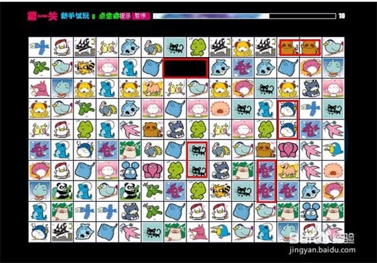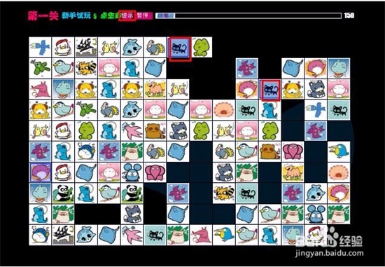 6、休息会之后我们就继续我们的连连看之旅,有的时候那些相邻的或是很好找的都消除了,剩下的那是怎么看都找不到可以下手的地方,时间还在流逝,没关系,游戏上方有个提示按钮,我们选择提示,在游戏中就有有两个一样的头像被特别的显示出来,这就提示我们那两个头像可以消除,所以赶紧去点了吧。