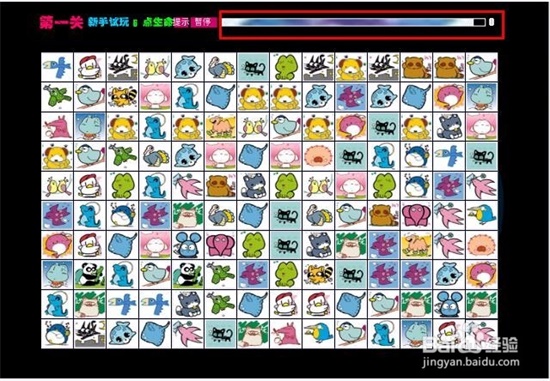 2、点击开始之后,就进入连连看主界面了,在最上方有个时间的横条,在不断的减少,也就是玩游戏的总时间,在这个横条消失之前要把游戏内所有的宠物头像消除干净,消除不完就是失败了。如图: