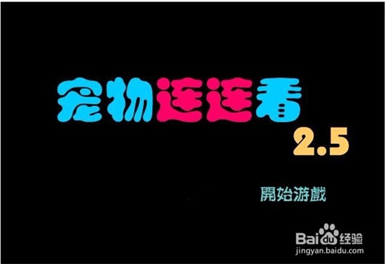 1、首先我们打开游戏,首先我们可以看到这次的宠物连连看画面有些不一样的地方,纯黑的背景,大大的宠物连连看几个字旁边是醒目的2.5,这个游戏的版本就是2.5,下边是开始游戏的繁体字,然后我们点击开始。
