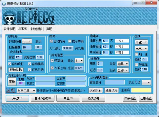 光行资源网提供的蒙奇烽火战国辅助 v1.0.2 绿色版是一款专门为烽火战国游戏设计的游戏辅助工具。这款软件给烽火战国的游戏玩家带去了很多便利,软件采用按键精灵编写,可以模拟鼠标、键盘进行操作,使用方便,并且十分安全,不必担心封号。这款软件专门为不清楚如何使用的用户设计了软件说明模块,软件的主面板模块内可以设置找野地、跑商、刷喇叭、国战等内容,软件还有一个来敌预警模块减少了玩家的死亡率。可以在修改热键按钮内改变快捷键,重新定义,调整到适合自己为止。