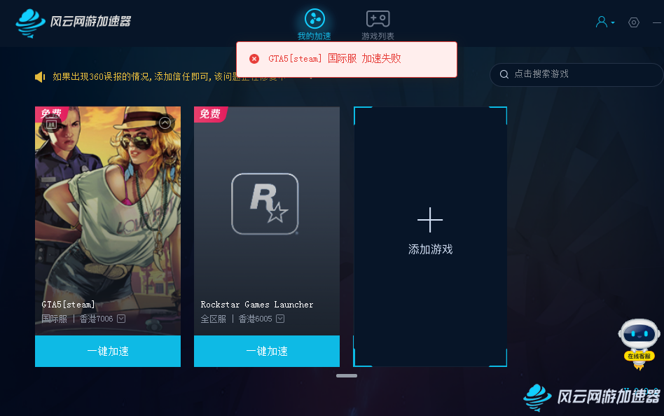 步骤 2. 关闭“360 安全卫士”,重新启动加速器即可。如果还是提示加速失败,卸载风云加速器重新安装(在关闭 360 安全卫士的前提下)
