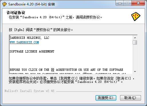1. 到本站下载安装 Sandboxie,打开安装程序,点击下一步继续安装