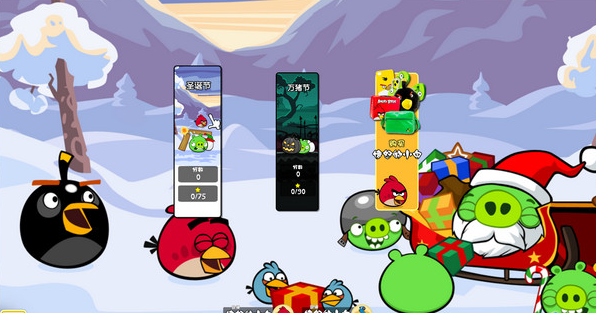 愤怒的小鸟2012季节版中,绿色的猪戴了上红色的圣诞帽,而小鸟们在满天漫天飞雪的美妙情景下与猪展开了新一轮的作战,他们又制造了新的游戏道具,貌似一个会增大的大橘子;在拆大堂和万猪节的新副本中展开新的交锋!