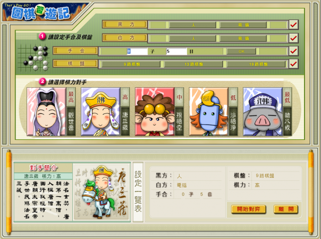 唐三藏完成取经任务后,沿途接受了很多活泼可爱的妖怪,为了使这些妖怪取得正果,终于在很多经书中选择了棋经一书,用动画教导妖怪,使其智慧生灵性完全消除魔性。围棋入门软件,从围棋的起源、围棋的规则开始,典型的例子说明围棋的基本手段、布局理论、中盘技术、收官计算,教你围棋。动画形象生动,各章加入大量实战练习题,随着程序赠送9路、13路人机游戏软件,现在可以练习。人声说明,即使是不会读字的孩子也能简单地自学。