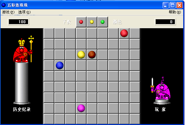 游戏分九行九列八十一格。点击彩球移动到期望的位置,每移动一次,画面将随机出现3个新的彩球;当同一颜色的彩球连成5个一行或一列或一斜线时,这5个彩球同时消失,游戏得分。当画面上每个方格都被彩球占满时,游戏结束。(即,要想获得更高分,就要使彩球消失的速度尽量快,以延长游戏时间和空间。)