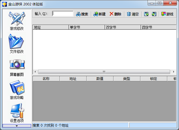 游戏进行中,随时叫出游侠修改游戏中的数值,瞬间就可以把你手中仅剩的5元钱变为5千万,模糊搜索工具,金山游侠V可以修改没有精确数字表示的状态条类数据,比如体力即将系将耗尽,修改后整个状态条会加满。
