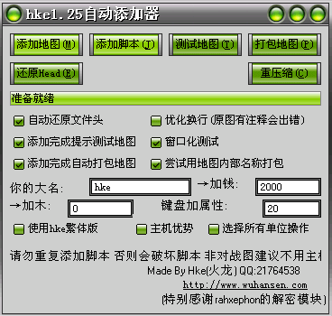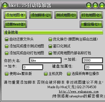 HKE1.25自动添加器支持单人/多人作弊 功能丰富 CMD+方向键+菜单 支持高隐作弊。指挥官广泛应用于矿图,对抗RPG、3C等地图有各种实用、恶作剧、无聊的功能,现在宇宙中强大的魔兽霸权3冰封王座的作弊脚本。