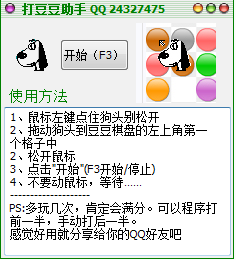 将狗头拖到打豆豆的棋盘第一个格子中心,松开鼠标点击开始,等待软件自动打豆豆。最后会留部分豆豆,是为了增加游戏的娱乐性,让您自己完成200分。