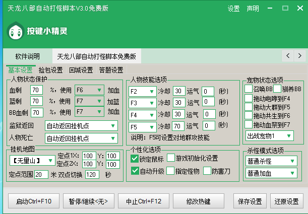 天龙八部自动打怪脚本是一款为天龙八部开发的辅助工具,天龙八部自动怪物脚本是基于按钮妖精制作的,具有自动怪物、自动怪物功能,界面简洁,操作简单,稳定不易掉线。感兴趣的可直接下载哦!
