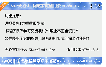 cf天心辅助是一款专业的cf透视显鬼工具,这是免费的网吧家庭通用版,可以帮助玩家获胜。支持通过最前线cf1.3.8版本,在游戏中通过F12呼叫使用。给您带来前所未有的体验,感兴趣的快来下载哦!