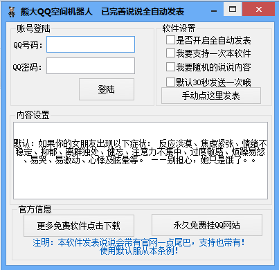 相信很多用户可能对QQ空间来说是每天必进的一个地方,但是你观察过QQ空间吗?是的,今天的小编带来了帮助用户快速提高空间水平、提高空间人气的软件。那是熊大QQ空间机器人!有说话自动发表,定时发表随机内容,定制内容。喜欢的赶紧来下载哦!