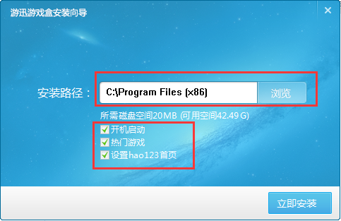1、到本站下载安装游迅单机游戏盒,打开安装程序,选择安装路径,这里只有一个注意点,软件默认开机启动、热门游戏、设置hao123首页,根据自行需要选择。