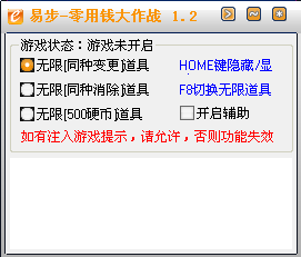 易步零用钱大作战辅助是一款非常小巧简单的辅助软件。打开以后,进游戏,然后点击开启辅助,如机子上装有杀软,会有注入游戏提示,必须允许,否则辅助功能失效,游戏开始以后,左右移动,无限按s键即可,f8切换道具,home隐藏/显示辅助。