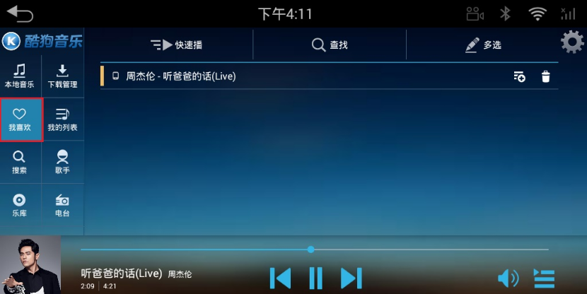 酷狗音乐车载版,强大的本地歌曲管理:一键导入,列表管理,尽情享受本地音乐。下载管理:会看到正在下载,和下载历史,而横向会显示歌曲名称、状态、大小、速度、进度等,可以对歌曲进行收藏或删除。