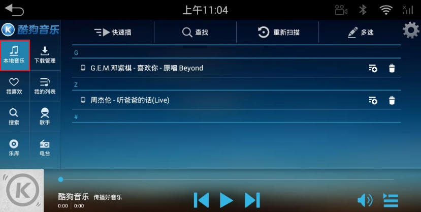 1、打开安装在车机桌面的酷狗音乐pad应用,进入主界面,左侧的导航栏集中了所有需要频繁触碰的功能区块,更能满足驾驶过程中司机单手点控操作的需求和操作使用习惯。登入界面时,默认在“本地音乐”,强大的本地歌曲管理,一键导入,列表管理,尽情享受本地音乐。