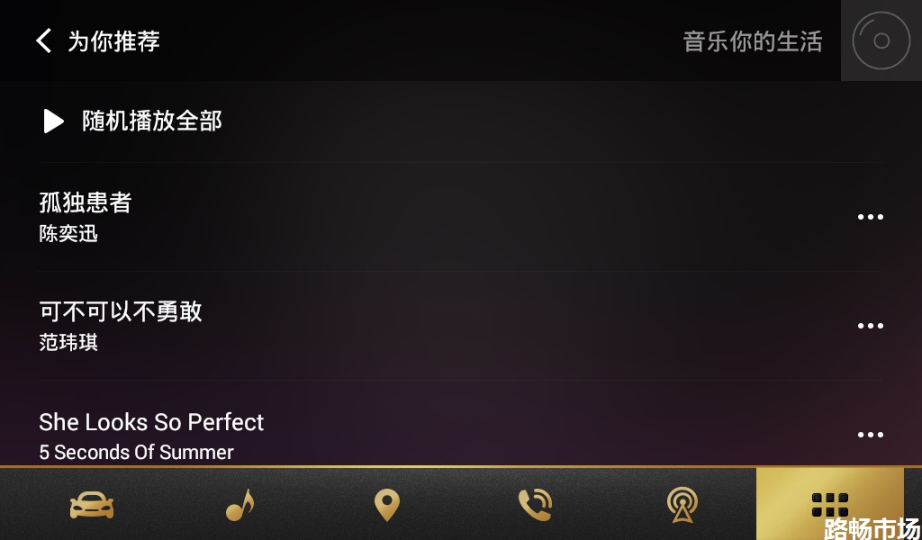 1、打开安装在车机桌面的QQ音乐车机版进入应用首页,可以看到首页布局非常简洁明了,整个场景设置易于车主操作。主要有:当前播放音乐、最近播放、本地音乐、为你推荐、个性电台和我的音乐六大版块。再加上左上方的设置,和右上方的搜索,这样,所有的功能在首页清晰呈现。