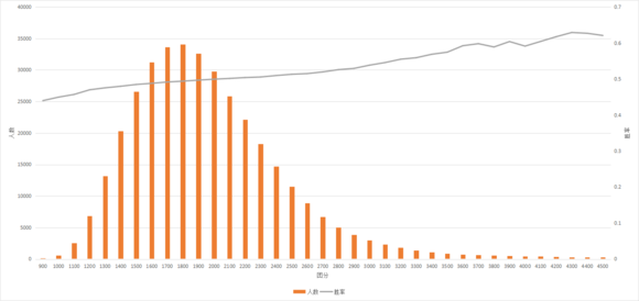 2,3000分以上的选手人数已经极少,4000分以上更是微乎其微。我为什么只统计到4500分?因为后面的数据和前面比起来,就是0。