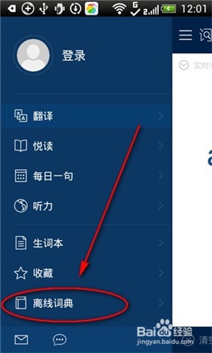 点击主界面左上角的【更多】按钮,打开主菜单,点击【离线词典】。