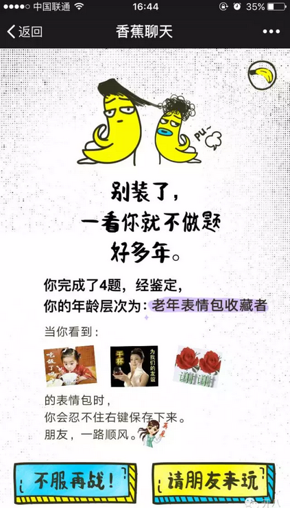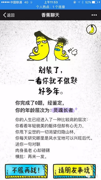 但是,我今天真的受桑了。今天,朋友圈在流传一个测年轻的游戏H5,八姐于是好奇心大发,围观了一下众友人的战绩,发现大都比较惨烈啊!有被鉴定为中医爱好者的、熊孩子爸妈的,还有老年表情包收藏者!八姐默默看着,内心已经笑炸。