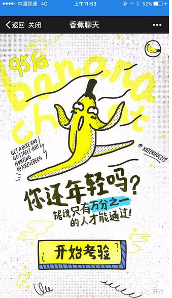 但是捏,我又好奇起来了,这个香蕉聊天又是个神马玩意?八姐搜索了一下,原来是一款面向95后的社交软件,研发团队是曾经开发了异步图片社交软件in的杭州九言科技。搜噶,这款软件今天开始公测,这个h5游戏就是来造势拉人气的嘛,哼。