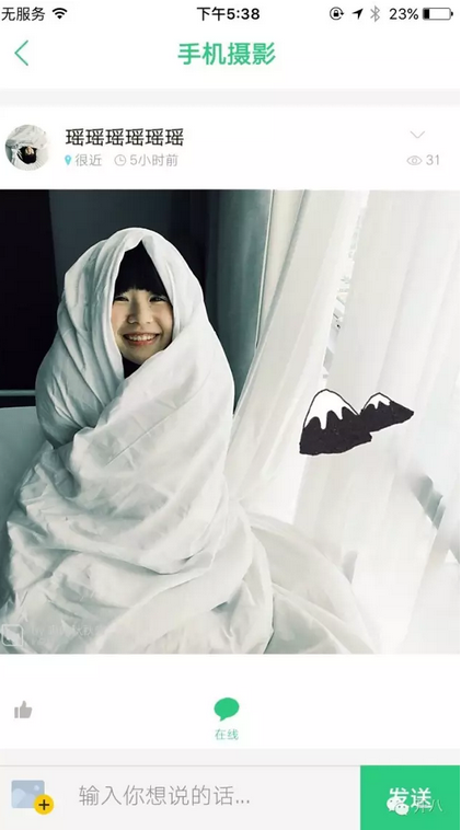 再比如说,可以边拍边聊。点击输入框,即可实时拍摄图片、视频,无法加载手机内原储存内容;且可直接在图片上输入文字、涂鸦。