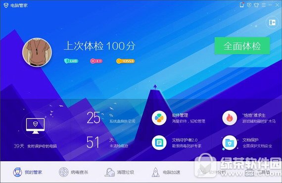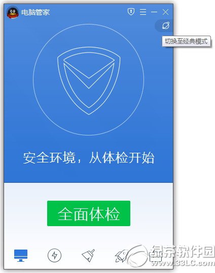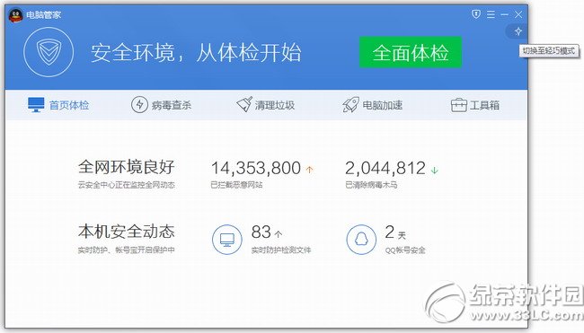 管家10版本,大、小界面统一保留了五大功能入口:首页体检、病毒查杀、清理垃圾、电脑加速和工具箱。