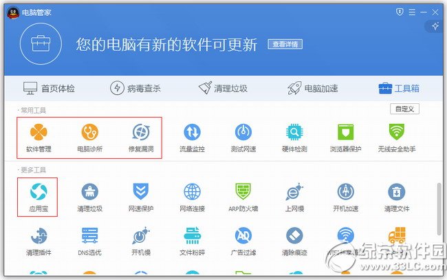 答:电脑管家8版本中的【软件管理】、【电脑诊所】、【修复漏洞】、【应用宝】在10版本中都搬到了工具箱中,以APP的形式呈现。
