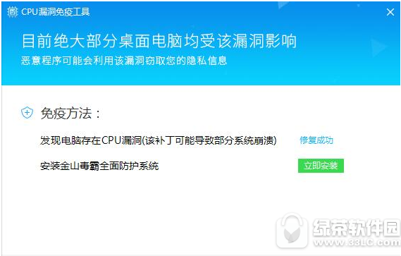 2、发布CPU漏洞免疫工具:由国外安全机构披露的CPU“Meltdown”(融化)和“Spectre”(幽灵)两组CPU漏洞,引发全球关注。漏洞几乎影响所有桌面电脑、笔记本和服务器,攻击者利用漏洞可以获得本该被系统保护的信息。 金山毒霸已紧急推出“CPU漏洞免疫工具”,漏洞修复、安全防护双管齐下,以阻断攻击者利用漏洞入侵的通道。该工具可一键检测电脑是否存在CPU漏洞,为存在CPU漏洞影响的系统安装安全更新,以免疫CPU漏洞。