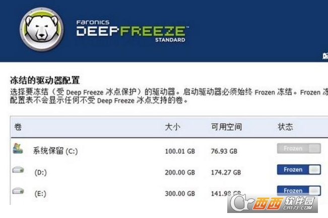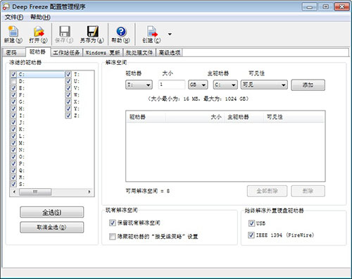 从冰点还原的“驱动器”选项卡配置管理器中可以设置特定卷作为解冻。不建议设置系统卷(在大多数情况下,C:)解冻。如果没有第二个分区ThawSpace可以作为创建虚拟分区保存数据。