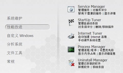 Ashampoo WinOptimizer 10还具备一系列的系统性能优化工具:服务进程管理、开机启动程序管理、Internet网络优化、进程管理和软件卸载等工具。通过禁止部分不必要的服务、开启启动程序、系统进程,对Internet设置进行优化和卸载不常用软件,来提高电脑开启速度、系统性能和稳定性。